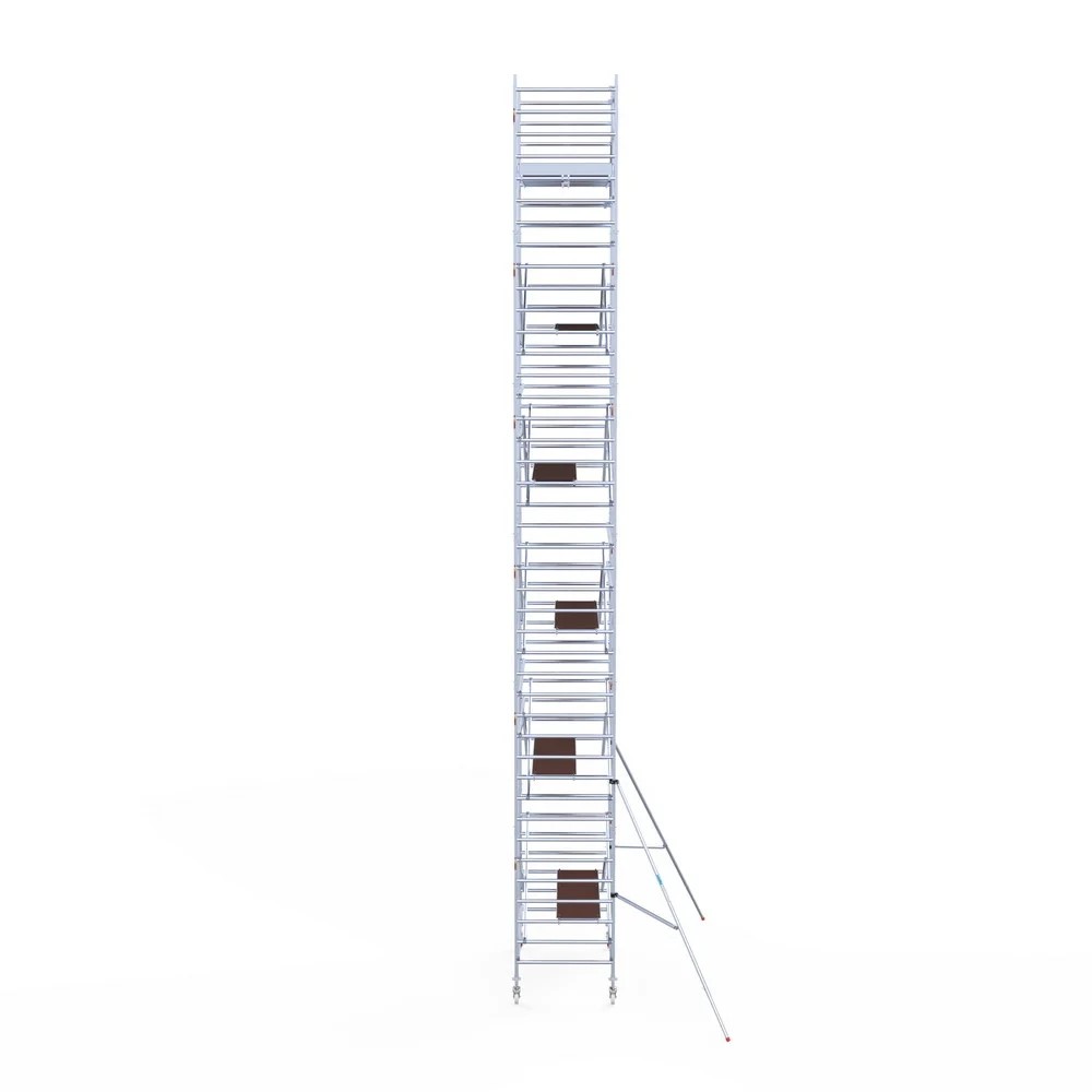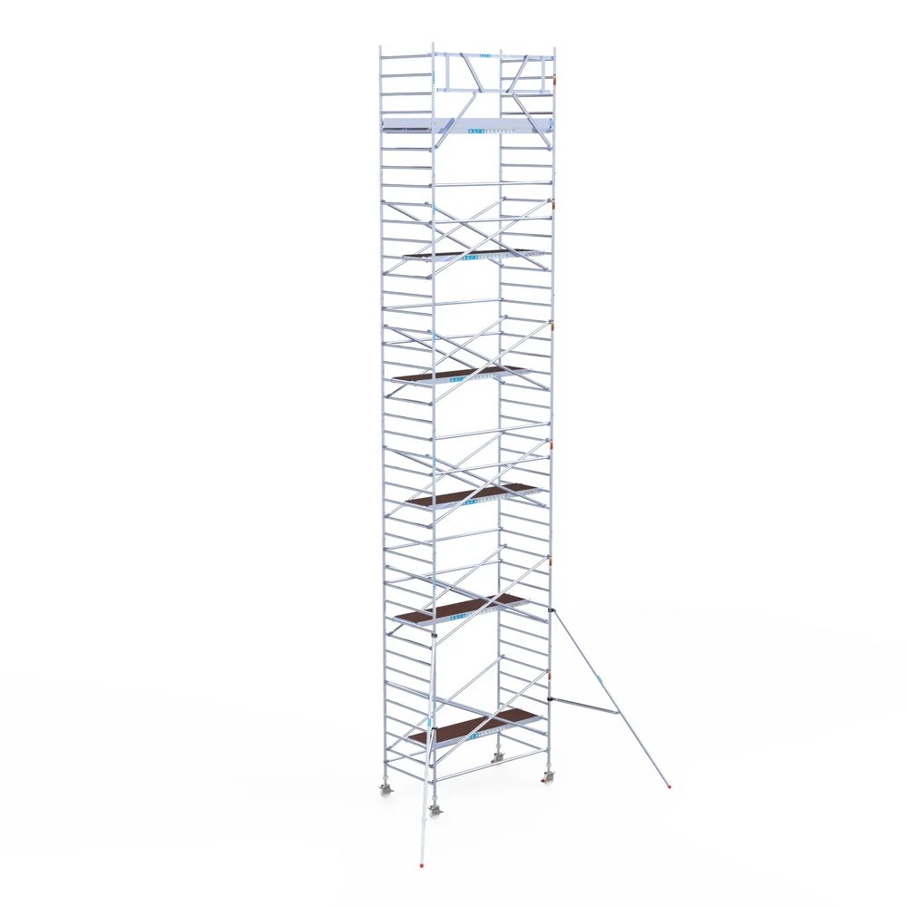 A wide rolling scaffold is stable and safe to use, you can easily work with 2 people on it. The platform can be placed at any desired height. It is possible to place two platforms next to each other. This results in a work floor with a width of 1.20 m. This wide mobile scaffold tower is suitable for indoor and outdoor work.
