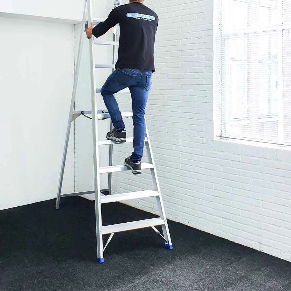 Eurostairs' aluminum step ladder with 9 steps is lightweight and has a dirt-resistant coating. The step ladder has a handy tool tray for small tools. Eurostairs professional step ladders are equipped with a double profile for extra strength. Thanks to the special hinge system, the step ladders are easy to fold. This user-friendly platform step ladder is suitable for intensive professional use or as household steps in and around the house.