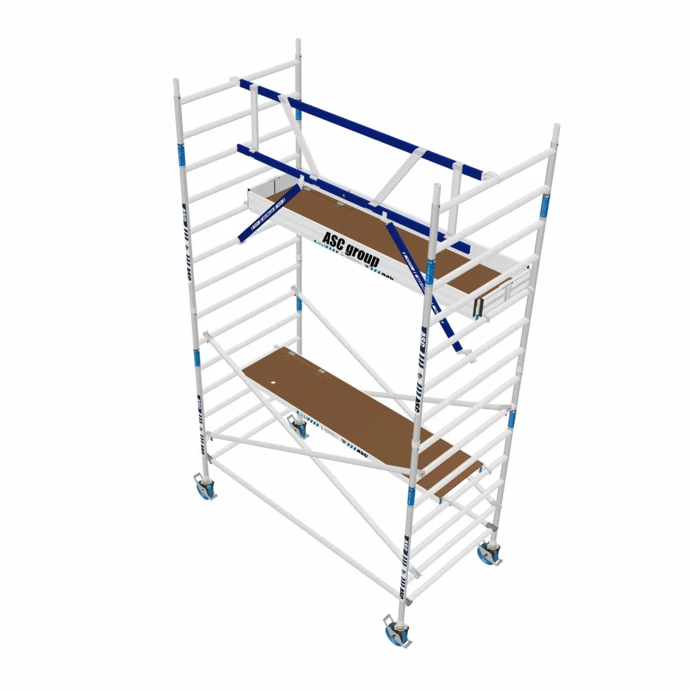 - L'échafaudage roulant professionnel de ASC est équipé d'une main courante à hauteur des genoux et des hanches à chaque niveau.