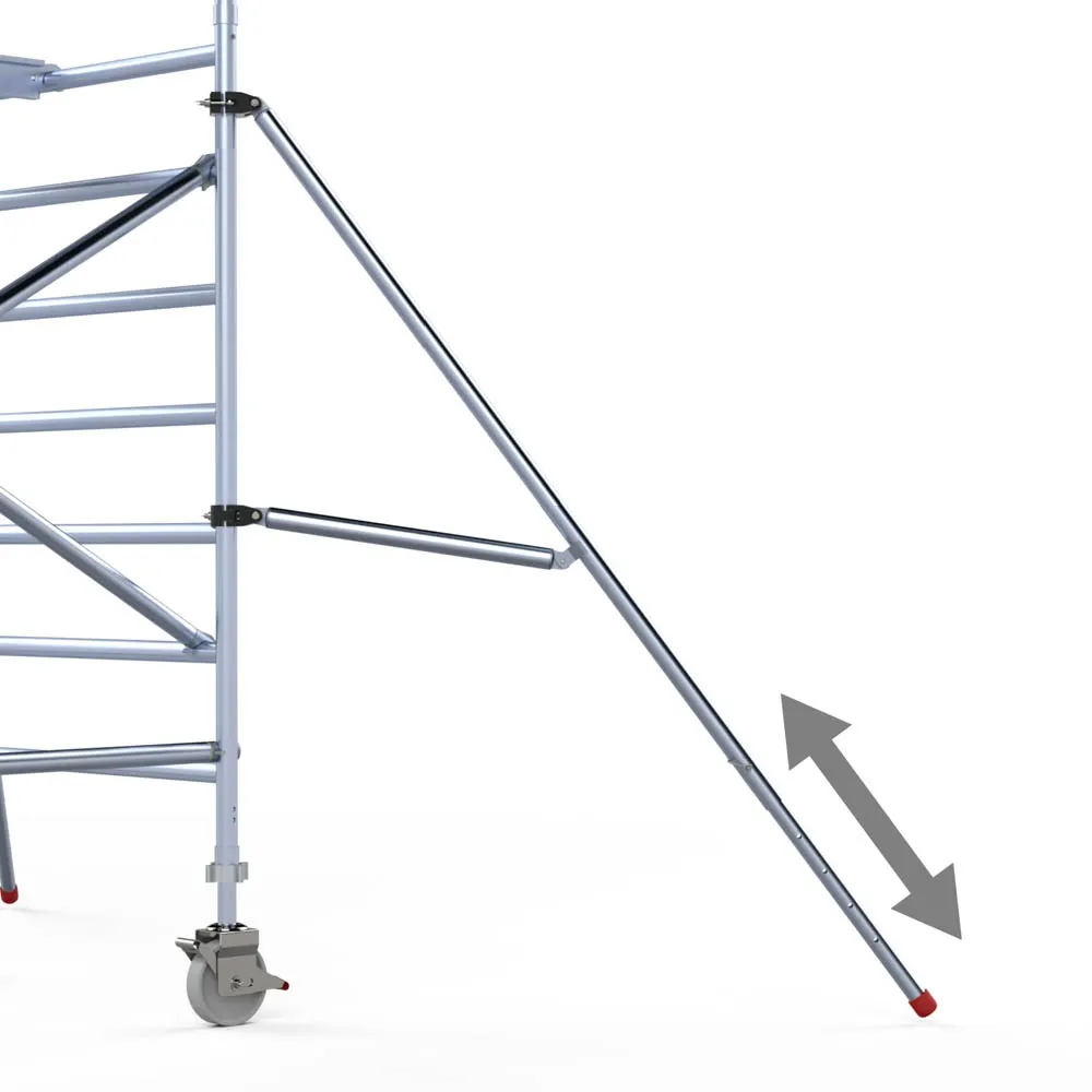L’échafaudage roulant standard ASC est équipé de roues à double freinage, réglables jusqu’à 25 cm, pour une sécurité et une stabilité optimales.
