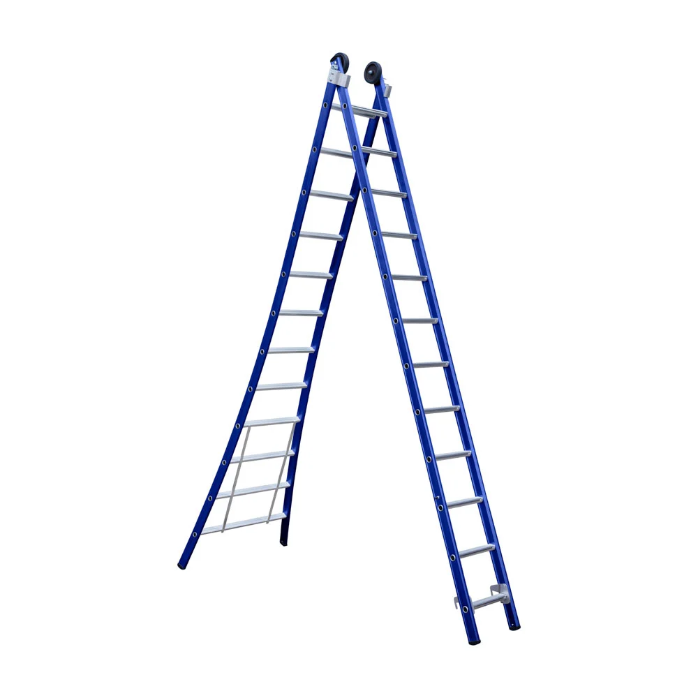 Echelle transformable 2 parties Eurostairs 2x12 échelons ✓ Arbres courbés ✓ Longueur déployée 550 cm ✓ Professionnel ✓ Aluminium revêtu de bleu ✓ Marches 40 mm.