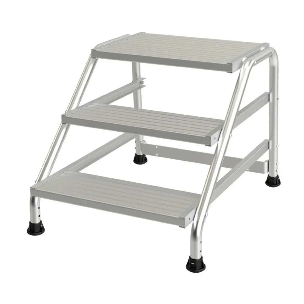 Les marches extra larges de 200 mm, dotées d’une surface nervurée antidérapante, garantissent une adhérence maximale et une sécurité optimale lors de la montée et de la descente. La large plateforme de 560 x 400 mm permet de se tenir debout de manière stable et confortable, même pendant des travaux prolongés.