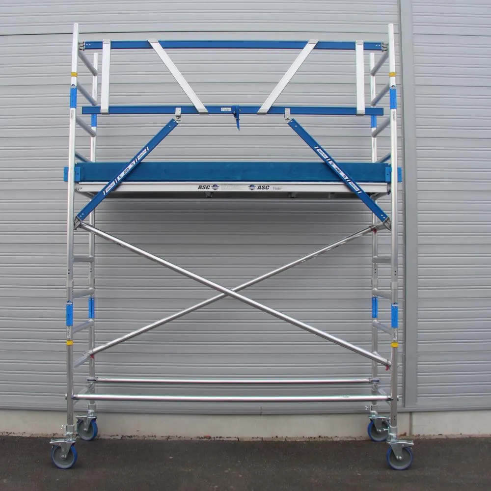 De ASC AGS PRO rolsteiger 75x250 voldoet aan de nieuwe norm. Vanaf 1 januari 2018 is het verplicht om altijd een leuning te hebben bij betreding van een volgend platform in een rolsteiger. De AGS waarborgt de veiligheid van de gebruiker door de mogelijkheid te bieden om een leuning te plaatsen vanaf een lagere platformhoogte. Door deze manier van opbouwen is een gebruiker na het beklimmen van een volgend platform direct verzekerd van en beveiligd door een reeds aanwezige leuning. Met deze nieuwe opbouwmethode heeft u veel minder onderdelen dan bij de traditionele rolsteigers zodat je de rolsteiger in snel tempo kunt opzetten.
