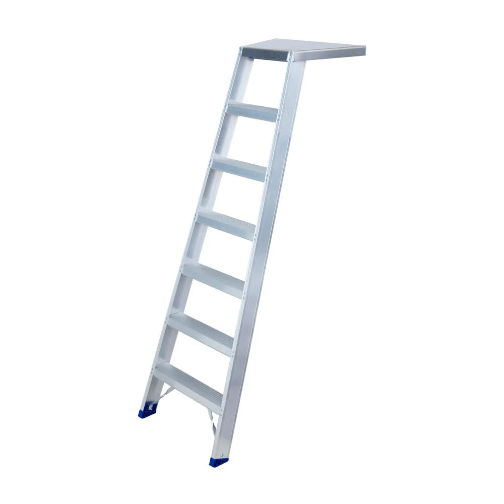 De Eurostairs voegerstrap met 7 treden is een enkele trap met platform dat tegen de muur steunt. De ideale trap voor professionele voegers en stukadoors. Uiterst licht en robuust, optimale stabiliteit.