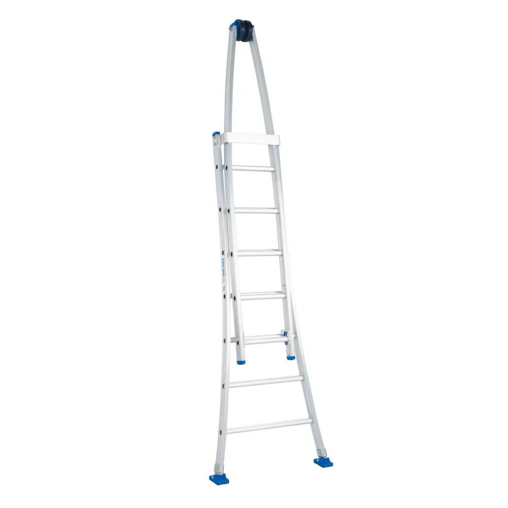 - De glazenwassersladder is standaard voorzien van pivoterende, tuimelvoetjes.