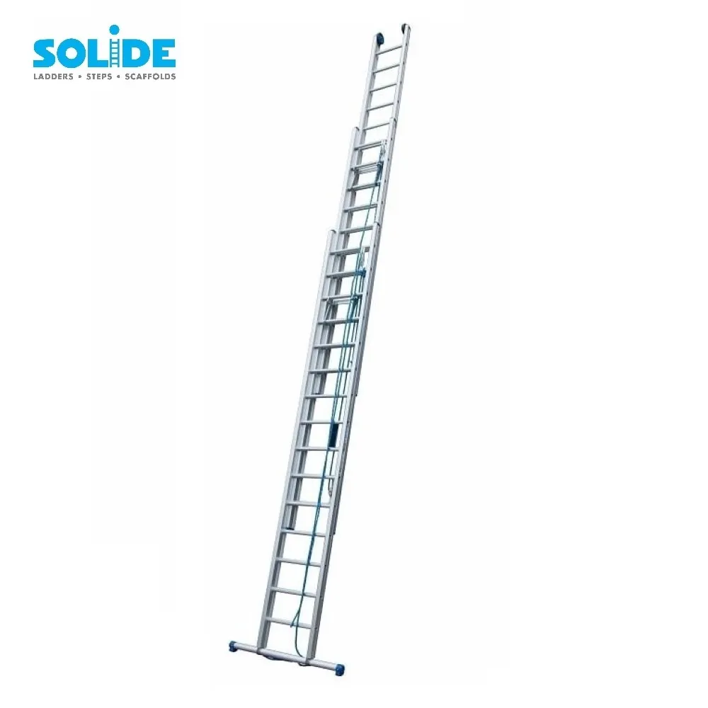 De Solide 3-delige touwoptrek ladder 3x16 sporten is een betrouwbare, robuuste ladder voor werkzaamheden op grote gebouwen. Deze aluminium ladder is ideaal voor professionals die veiligheid en stabiliteit op prijs stellen. De gevelrollen maken het gemakkelijk om de ladder te positioneren en in te stellen. Het optreksysteem ervoor zorgt dat de ladder eenvoudig en veilig kan worden uitgeschoven. De ladder draagt tot 150 kg en is gecoat voor extra duurzaamheid. Voldoet aan de normen EN131, NEN2484 en de Warenwet, wat zorgt voor een hoge mate van veiligheid en betrouwbaarheid. De Solide schuifladder biedt met zijn 10 jaar garantie een duurzame oplossing voor elke klusser of professional die regelmatig op hoogte werkt.