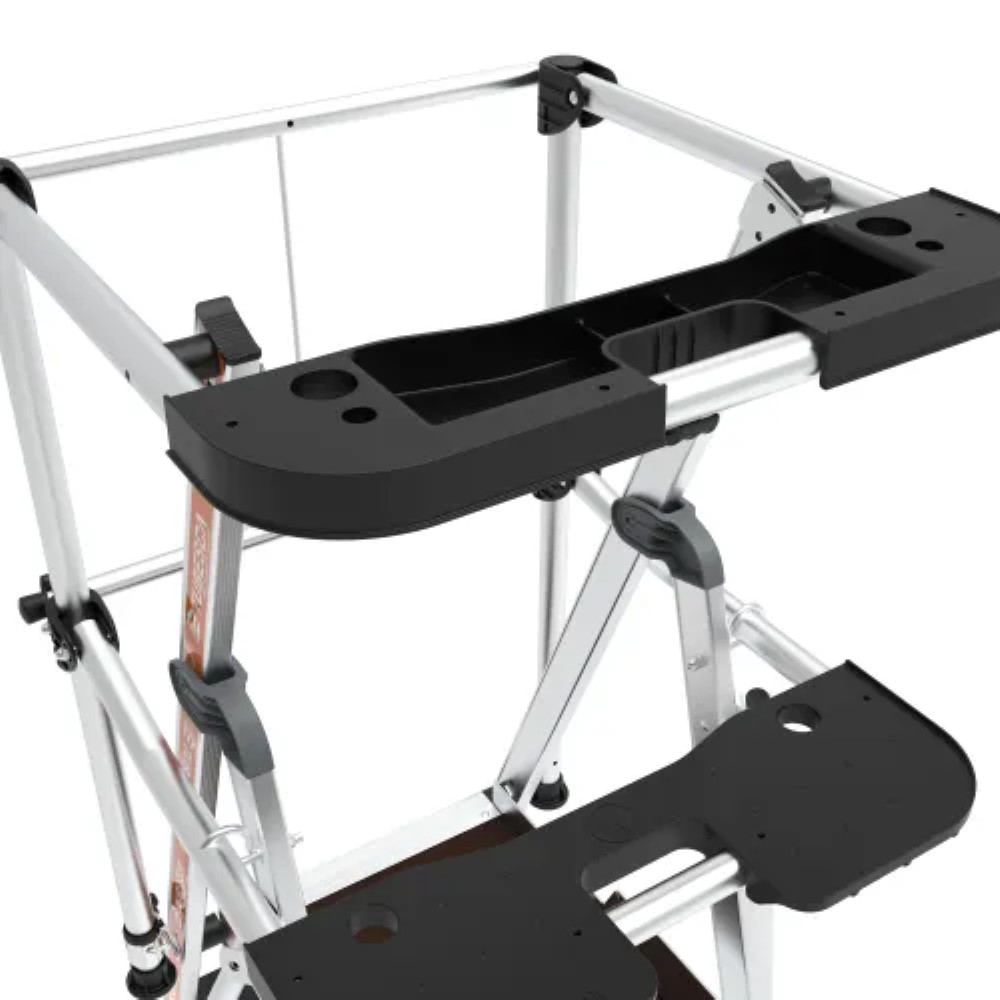Het ruime antislip platform van 500 x 400 mm en de geribbelde antislip treden (80 mm diep) zorgen voor een stabiele werkhouding, zelfs bij langdurige werkzaamheden. De geïntegreerde tooltray met een draagvermogen tot 25 kg maakt het mogelijk om gereedschap en materialen, zoals een verfblik van 5 liter, altijd binnen handbereik te houden.